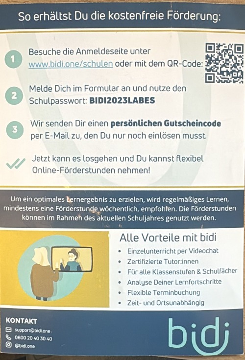 auch in diesem Schuljahr haben wir ein Kontingent von Gutscheinen für kostenlose Nachhilfestunden. Um sie zu nutzen einfach anmelden und den untenstehenden Code eingeben.
