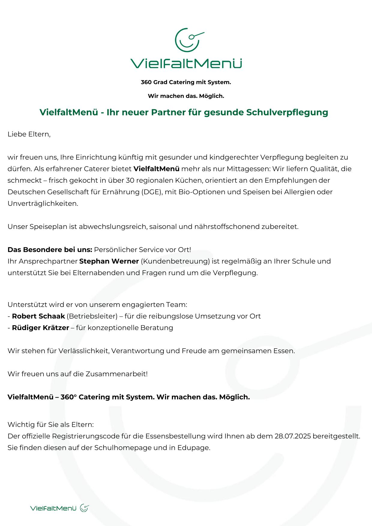 im kommenden Schuljahr wird es einen Wechsel des Essenanbieters für unsere Schulspeisung geben. Nachfolgend bereits einige erste Informationen hierzu.